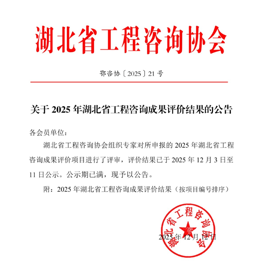 近日,湖北省工程咨询协会发布《关于2025年湖北省工程咨询成果评价结果的公告》(鄂咨协〔2025〕21号),我司凭借过硬的专业实力与优质的咨询服务,一举荣获一等成果与三等成果两项殊荣,彰显了公司在工程咨询领域的核心竞争力。