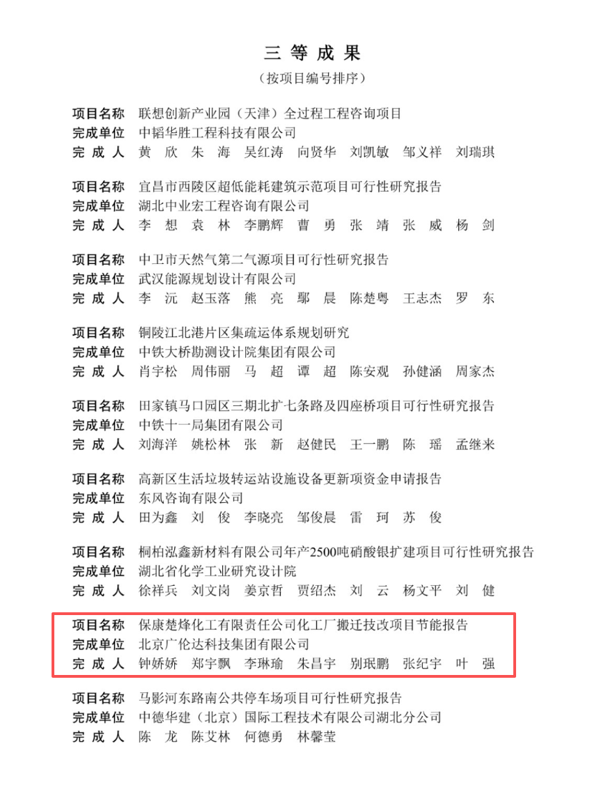在此次评选中,由我司完成的《点军区智慧农业及信息枢纽新基建建设项目可行性研究报告》凭借前瞻性的规划设计、科学的可行性分析及精准的技术论证,获评湖北省工程咨询一等成果;《保康楚烽化工有限责任公司化工厂搬迁技改项目节能报告》则依托专业的节能评估体系、详实的数据分析和可行的节能方案,荣获湖北省工程咨询三等成果。两项荣誉,是湖北省工程咨询协会及行业专家对我司工程咨询服务能力、技术创新水平与项目管理质量的高度认可。